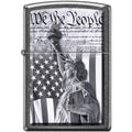 This Zippo lighter features the immortal words "We the people" over a black and white image of the American Flag, Statue of Liberty, and the Declaration of Independence. It comes packaged in an environmentally friendly gift box with a lifetime guarantee. For optimal performance, use with Zippo premium lighter fluid.