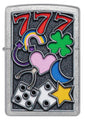Hearts, stars, horseshoes, and more—even a wishbone and Triple 7s! This Color Image design is packed with all the lucky charms you can imagine. Take a chance on this Street Chrome lighter and carry a bit of luck with you wherever you go. Packaged in a gift box, this lighter performs best when filled with Zippo lighter fuel.