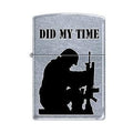 This Did My Time Zippo lighter on a street chrome finish displays the shadow of a soilder with their gun. This lighter would make a perfect gift for your favorite soilder. This lighter would make a great gift for your favorite soilder. It comes packaged in an environmentally friendly gift box with a lifetime guarantee. For optimal performance, use with Zippo premium lighter fluid.