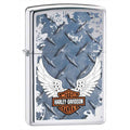 Add this Harley Zippo lighter on a high polish chrome finish to your collection. This lighter displays wings against a diamond plate design. This lighter is made in the USA and has a great lifetime warranty. Comes packaged in an environmentally friendly gift box. For optimal performance, use with Zippo premium lighter fluid.