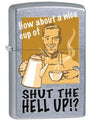 This Shut the Hell Up Design Zippo lighter comes in a street chrome finish. It is the perfect gift in its simplicity. It comes packaged in an environmentally friendly gift box with a lifetime guarantee. For optimal performance, use with Zippo premium lighter fluid.