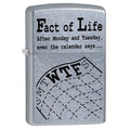 Fact of Life! After Monday and Tuesday, even the calendar says.. WTF. This lighter is made in the USA and has a great lifetime warranty. Comes packaged in an environmentally friendly gift box. For optimal performance, use with Zippo premium lighter fluid.
