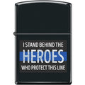 This Zippo lighter features the words "I Stand Behind the Heroes who Protect This Line", with the Thin Blue Line behind the word "Heroes". A wonderful Zippo for anyone that believes in the importance of the police force. It comes packaged in an environmentally friendly gift box with a lifetime guarantee. For optimal performance, use with Zippo premium lighter fluid.