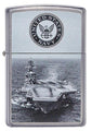 This Street Chrome lighter is color imaged to include the United States Navy seal on the lid with an aircraft carrier below. For optimal performance fill with Zippo lighter fuel.